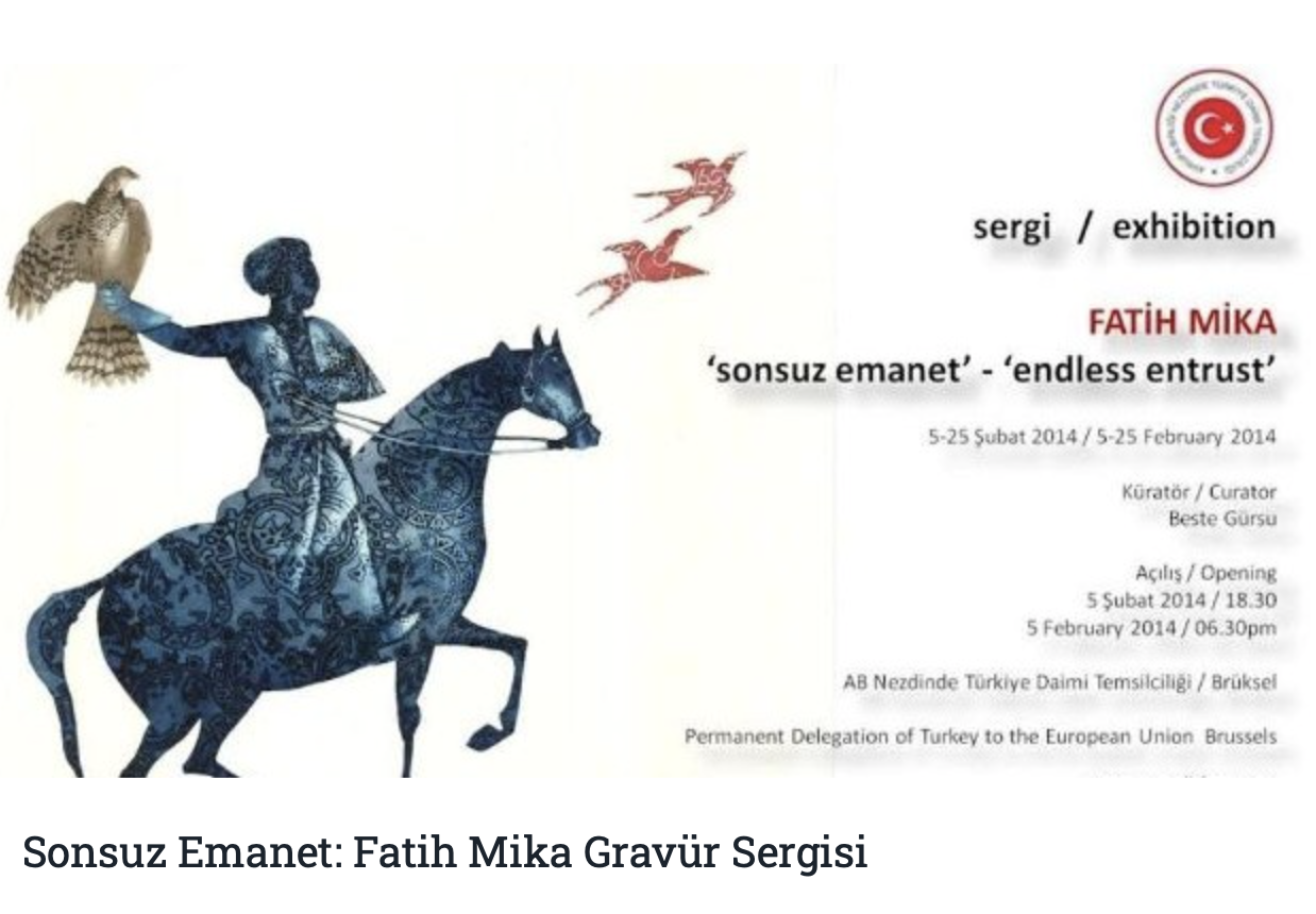 DevamıBelçika / Türkiye Daimi Temsilciliği Brüksel.. 5 - 25 Şubat 2014 ‘’Fatih Mika’’nın ‘’Sonsuz Emanet’’ başlıklı sergisi Brüksel’de sanatseverlerle buluşuyor…