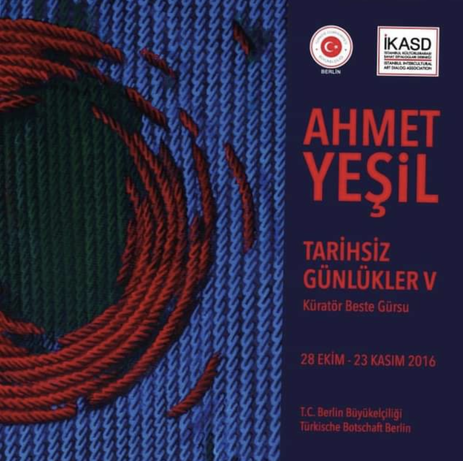 DevamıT.C. Berlin Büyükelçiliği.. 28 Ekim - 23 Kasım 2016 Ahmet Yeşil “Tarihsiz Günlükler V” sergisi ile Berlin’de sanatseverler ile buluşuyor….. “İstanbul Kültürlerarası Sanat Diyalogları Derneği (İKASD)”